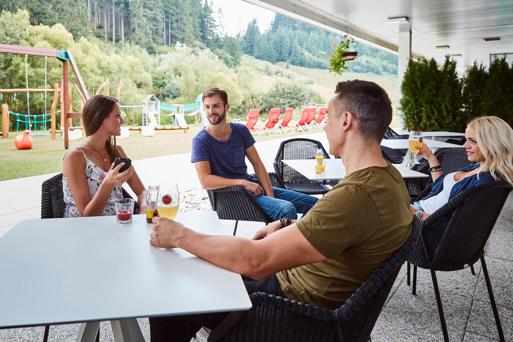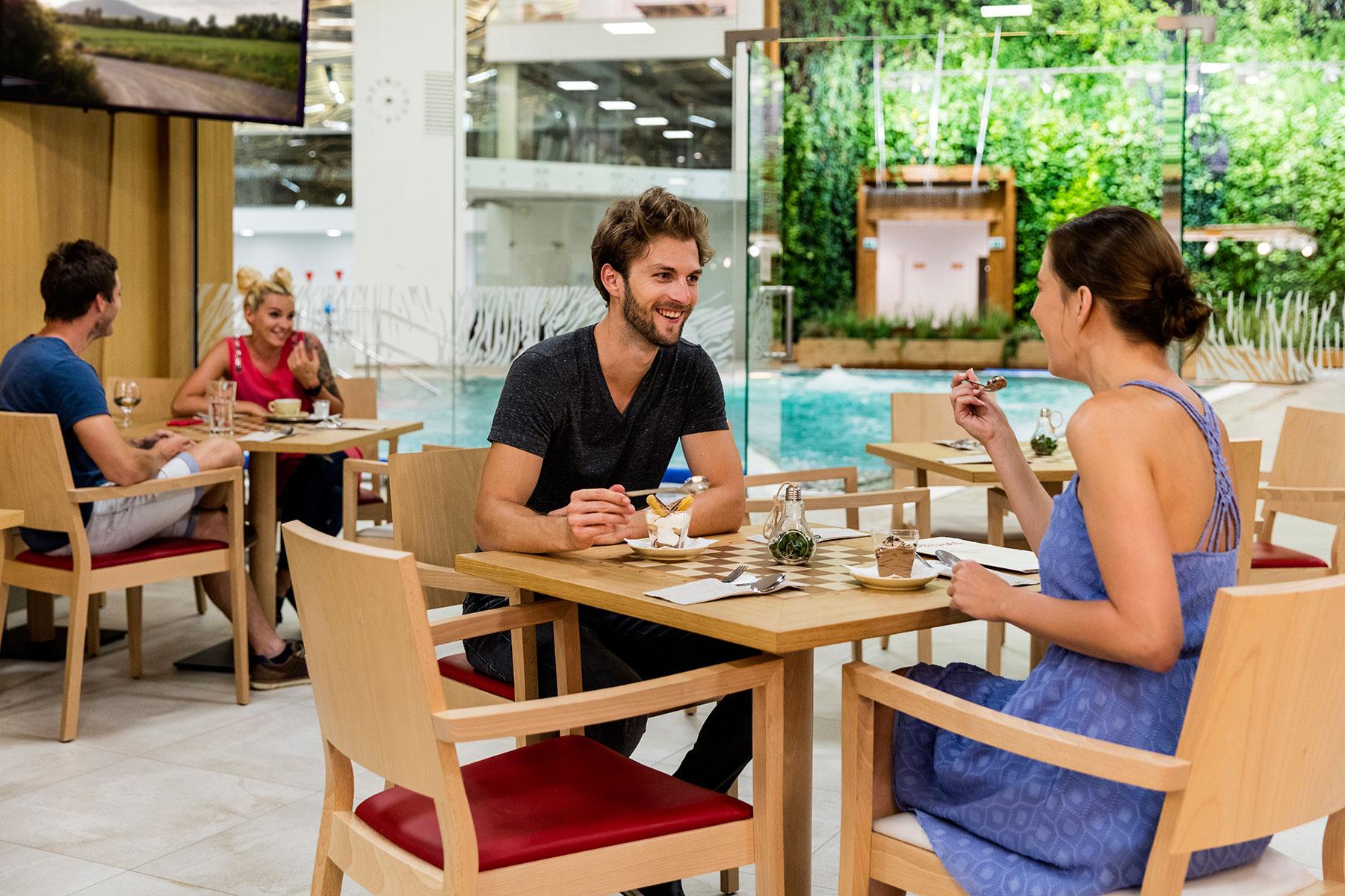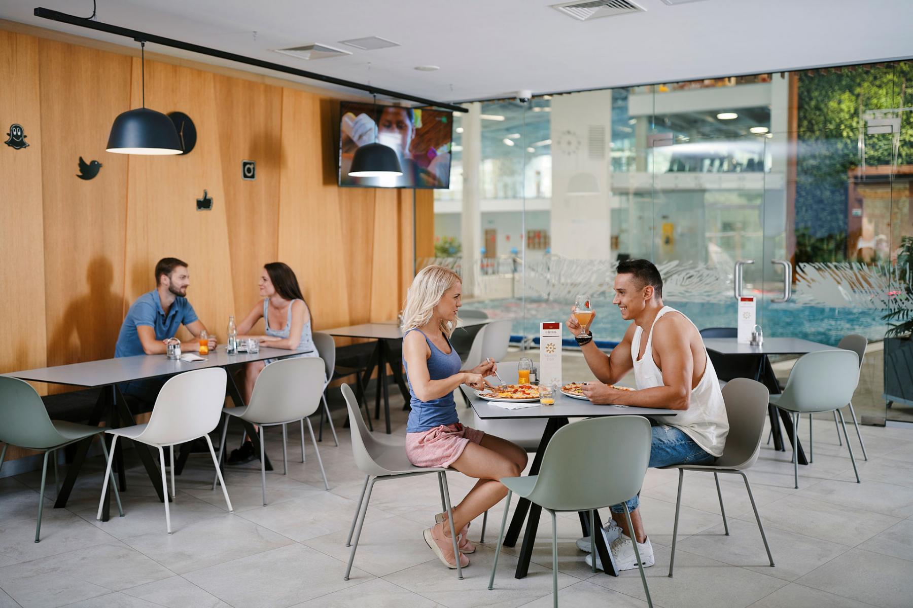 Jej prednosťou je atraktívne optické prepojenie reštaurácie s priestormi bazénov (nie priamy prístup do bazénov) a vonkajšia terasa s prepojením na detské ihrisko.