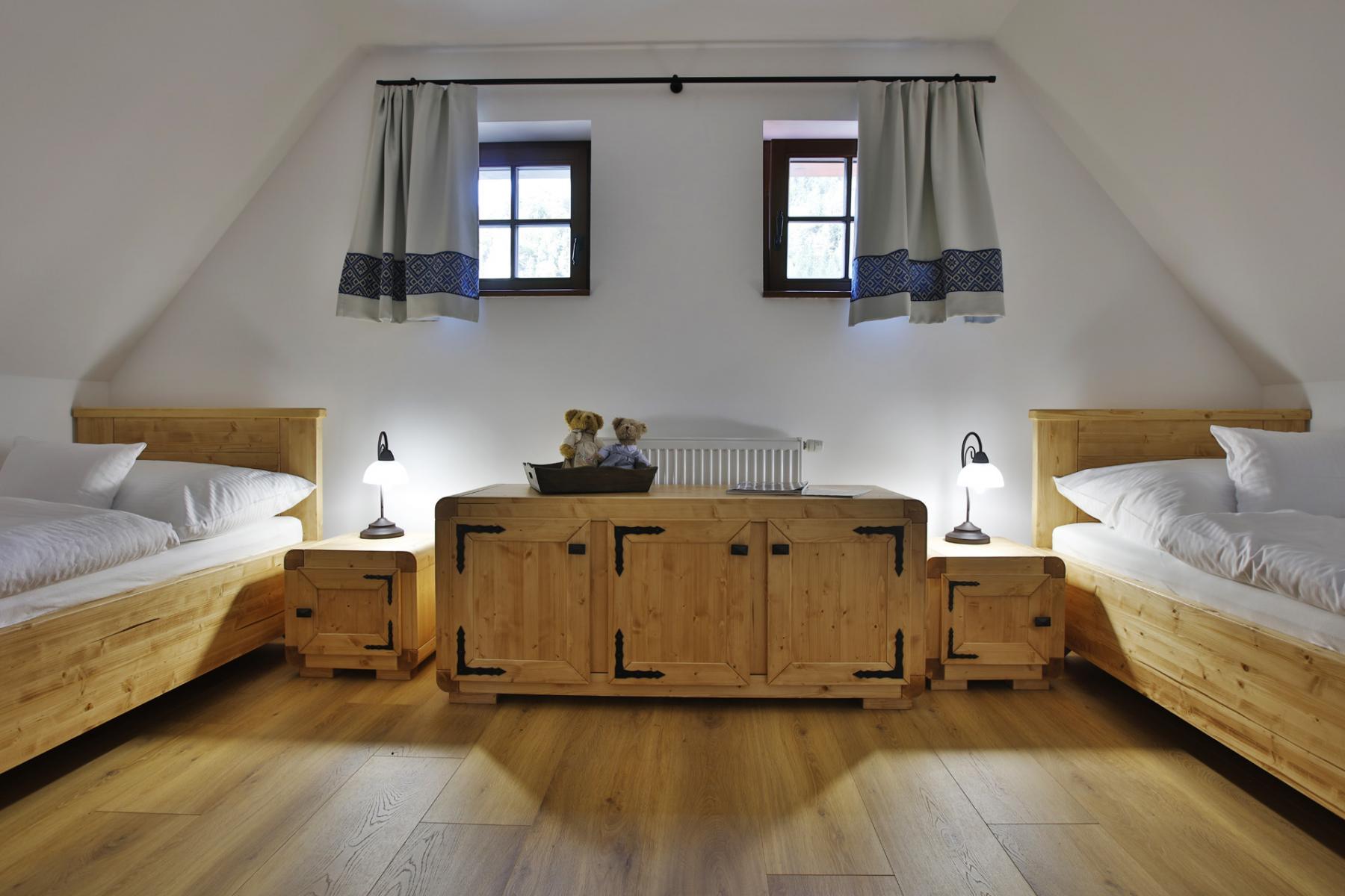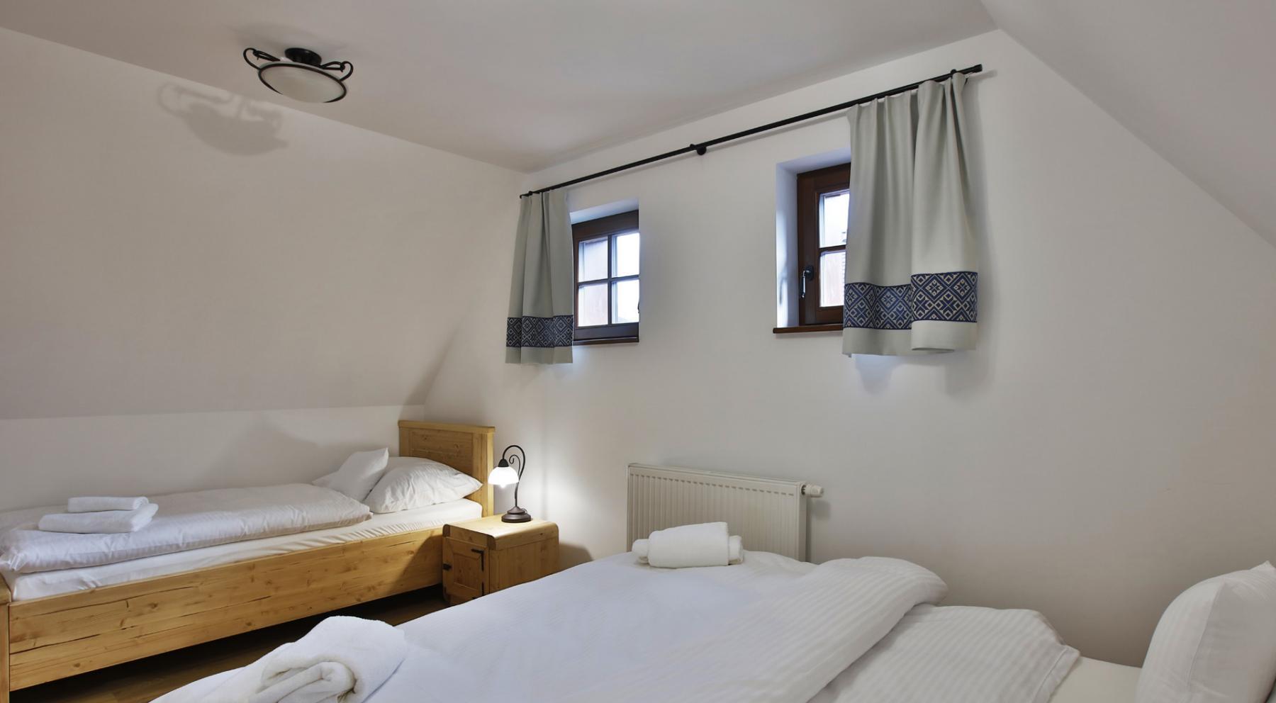 Na poschodí sú dve spálne – jedna s manželskou posteľou a druhá s dvoma oddelenými lôžkami.