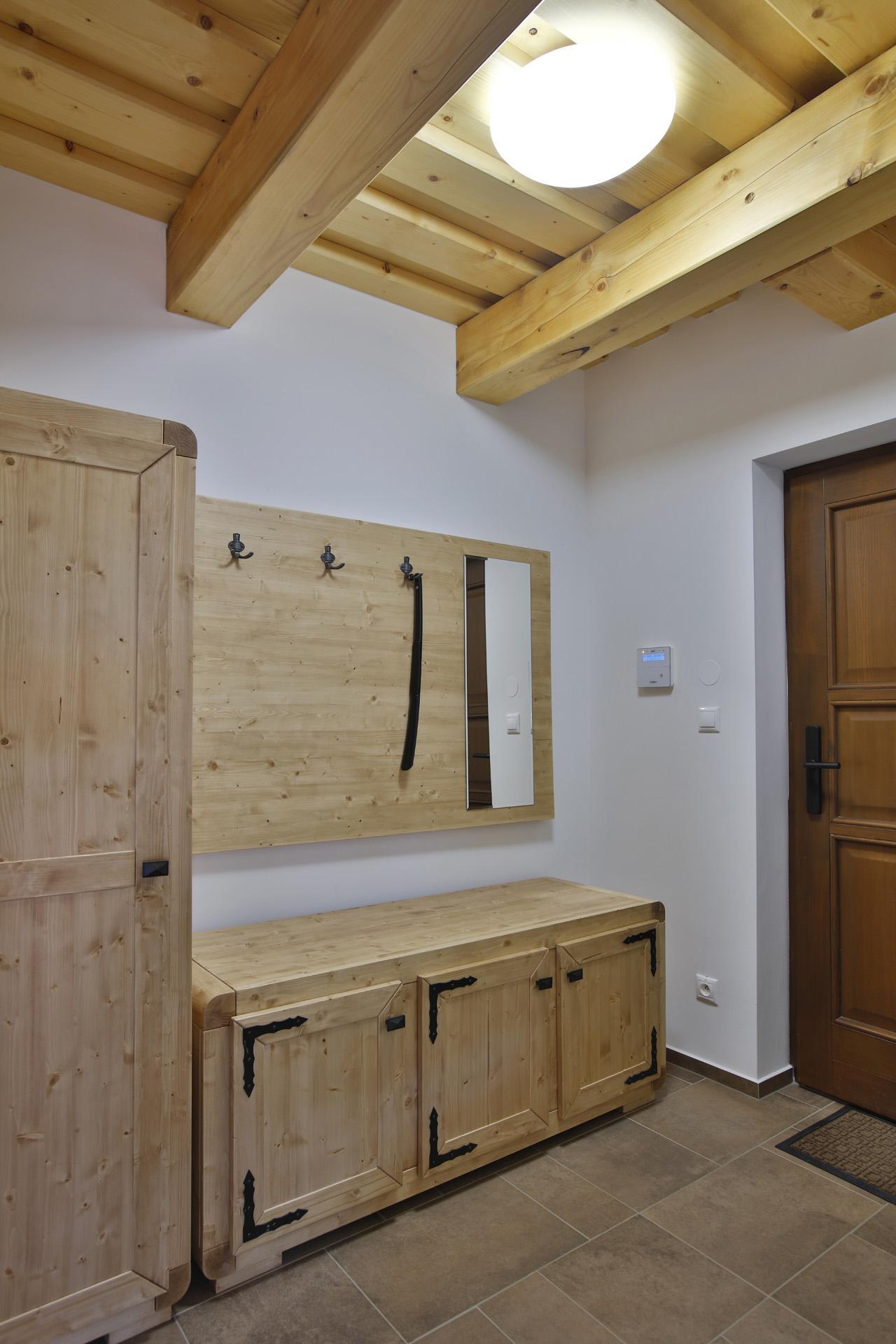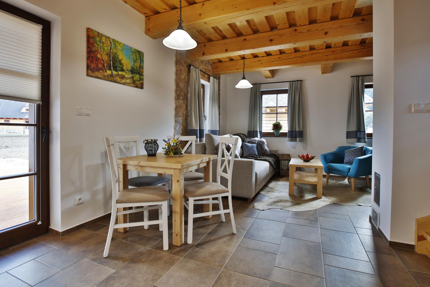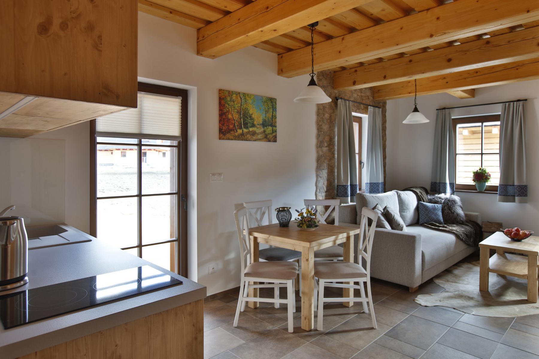 Interiér dýcha tradičnými prvkami, ktoré dopĺňa moderný nábytok. Prevládajú v nich najmä prírodné materiály ako drevo či kameň.