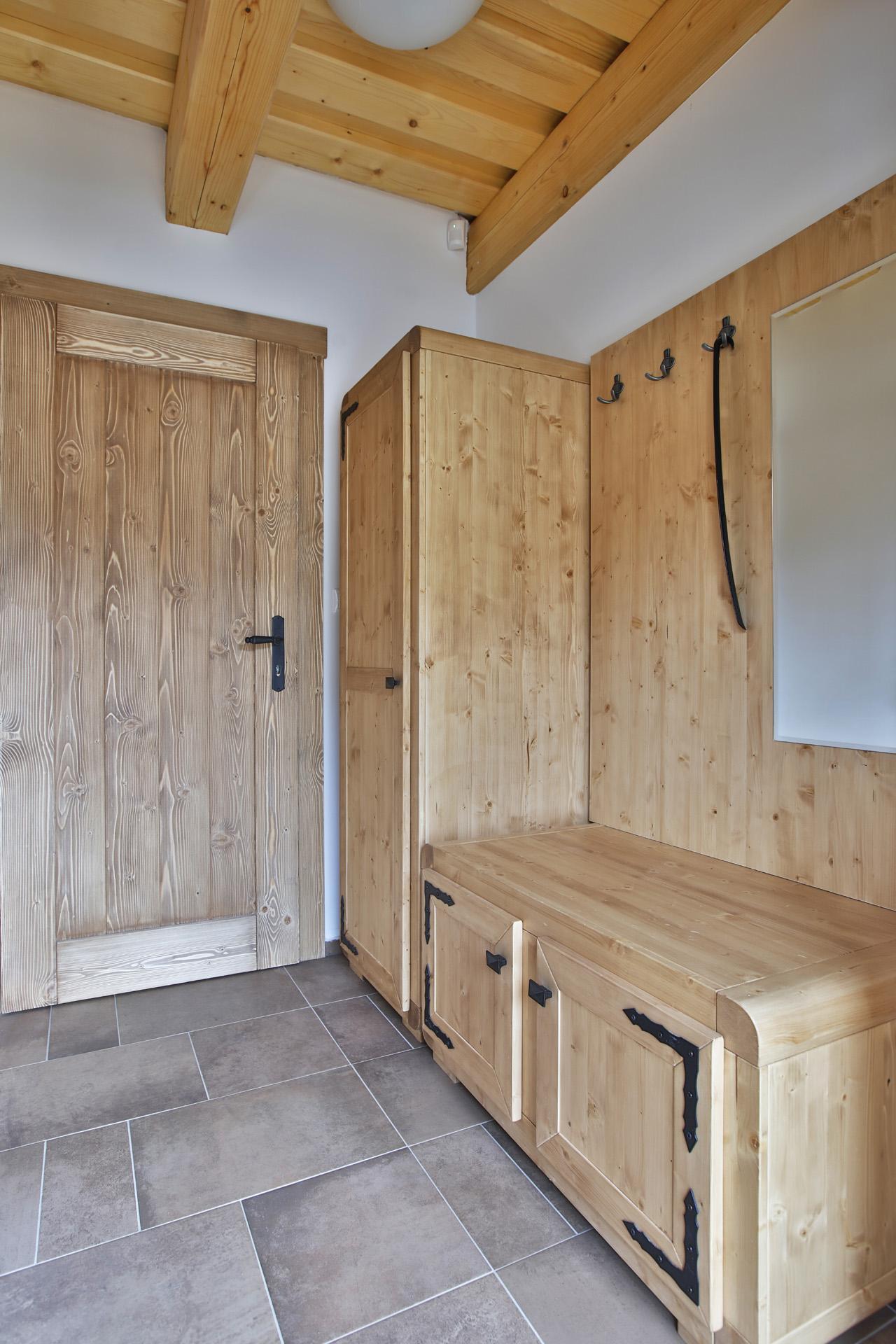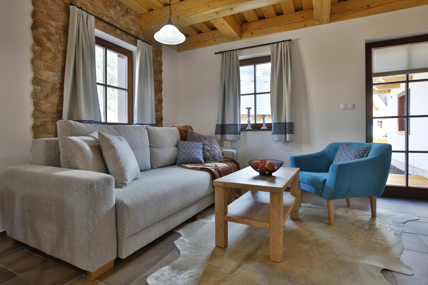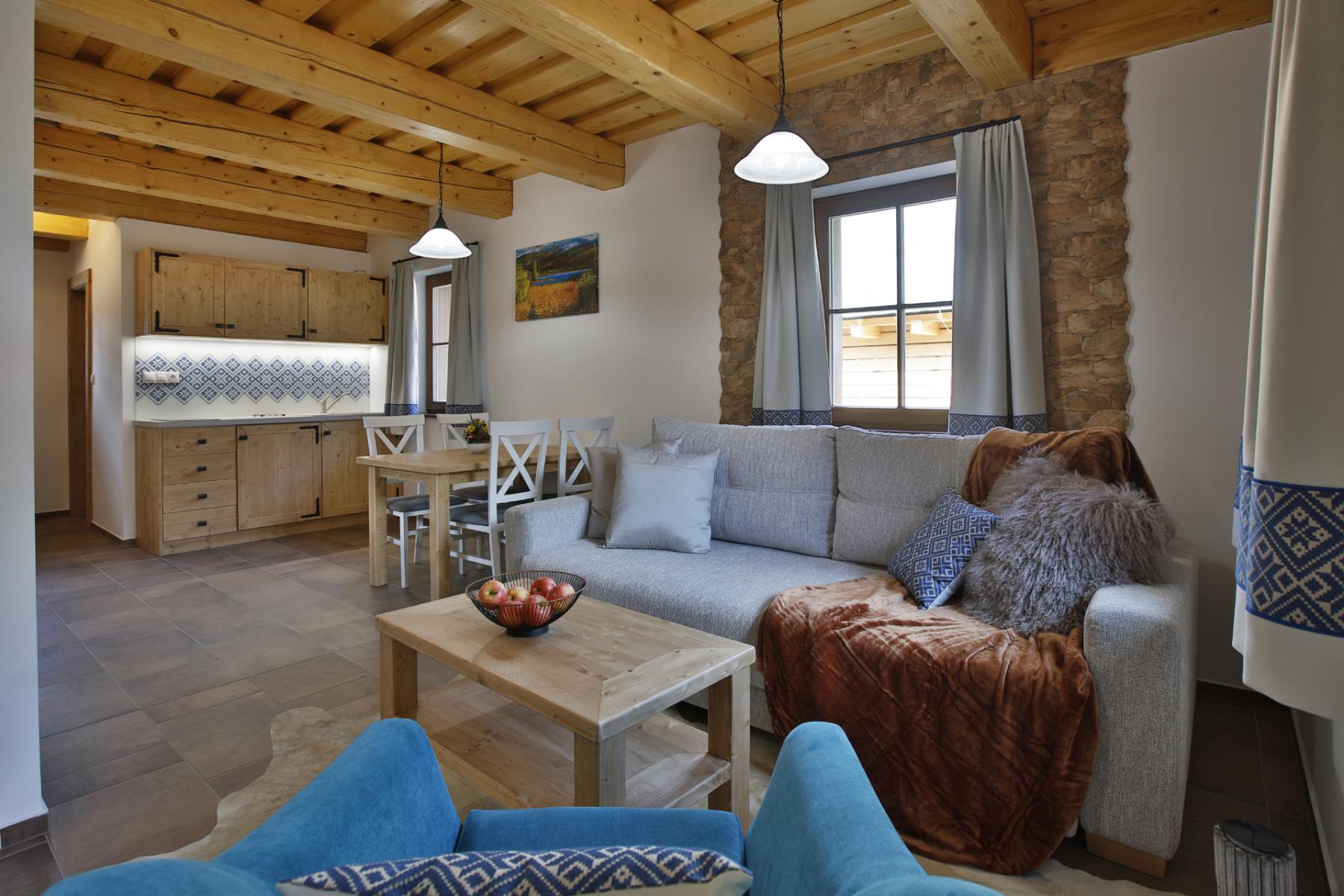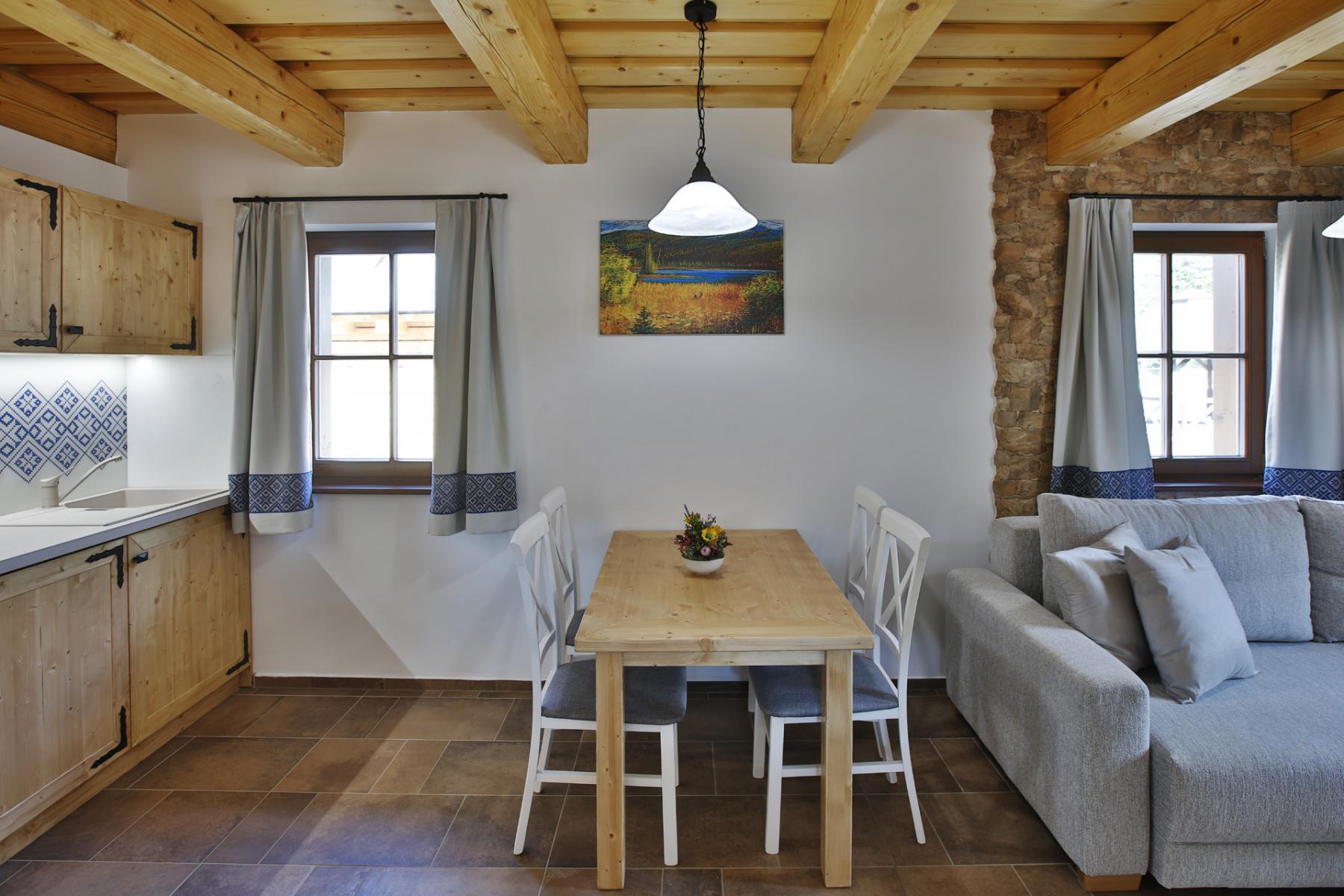 Interiér chalupy vyniká tradičnými prvkami ľudovej architektúry, ktoré dokonale dopĺňa moderný nábytok a poteší i náročnejšieho klienta.