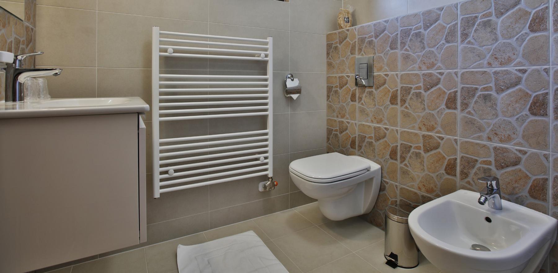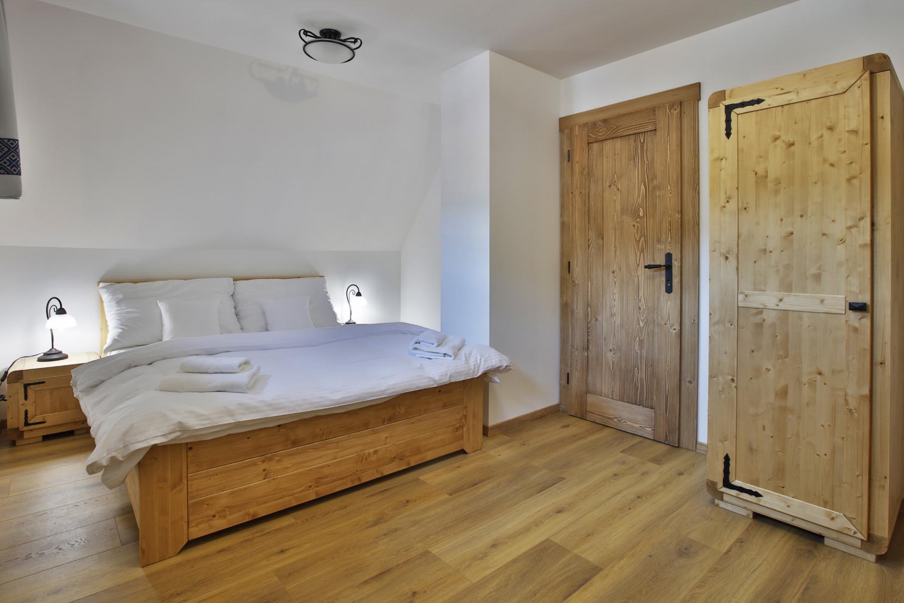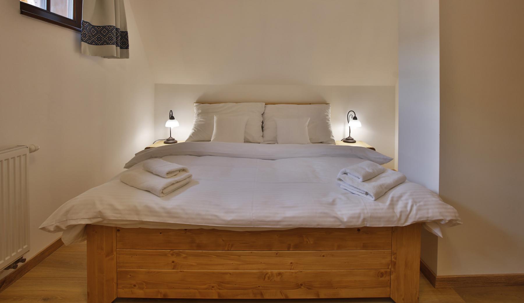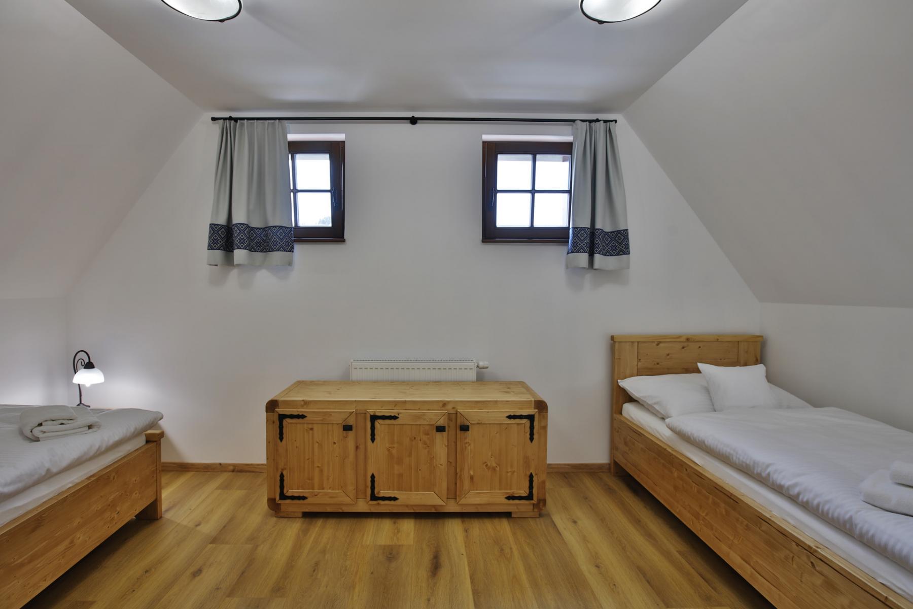 Lôžková časť je na poschodí. Sú tam dve spálne – prvá s manželskou posteľou + 1 lôžkom a druhá s dvoma oddelenými lôžkami.