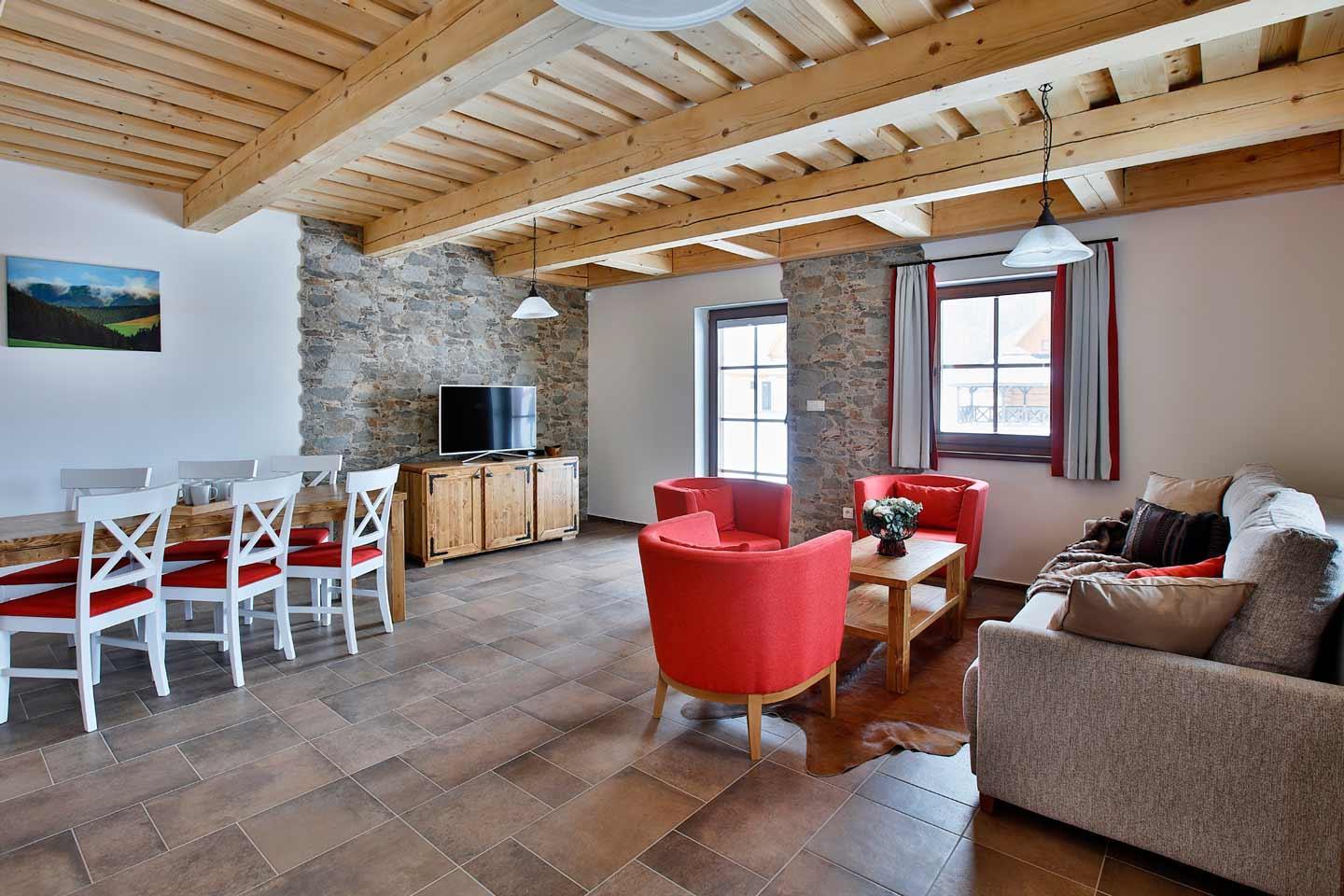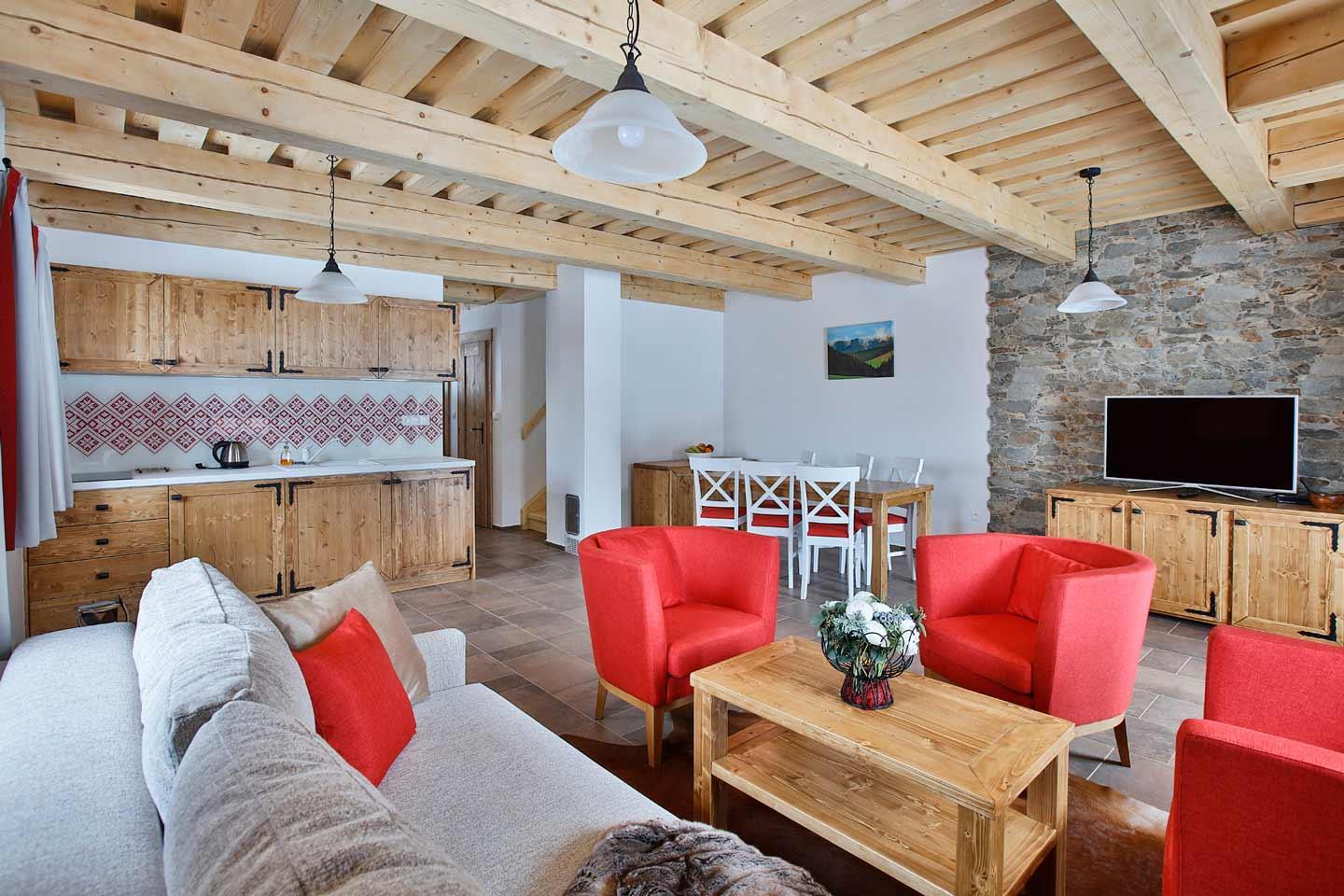 Rozloha chalupy typu E je 100 m2 a zmestí sa do nej 2 - 7 osôb. Na prízemí sa nachádza dostatočne veľký priestor, kde si môžete zložiť pokojne aj celý lyžiarsky výstroj.